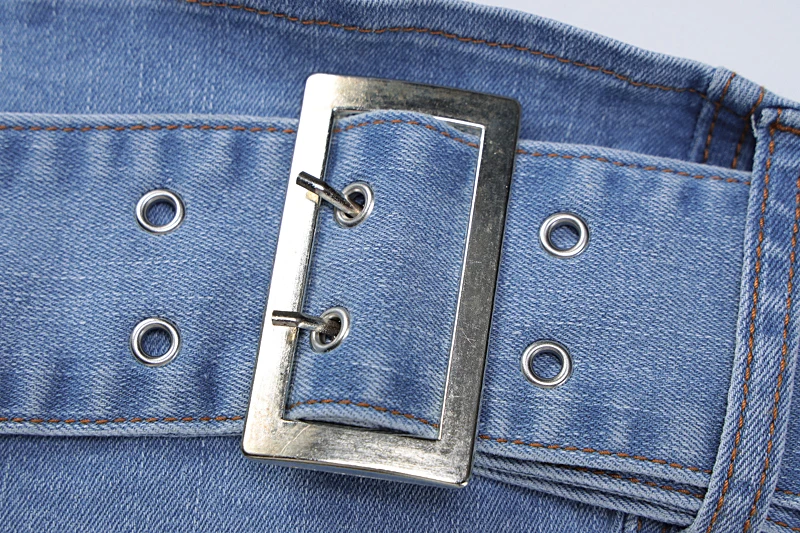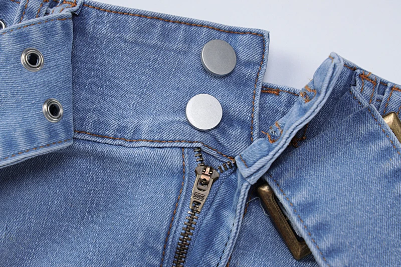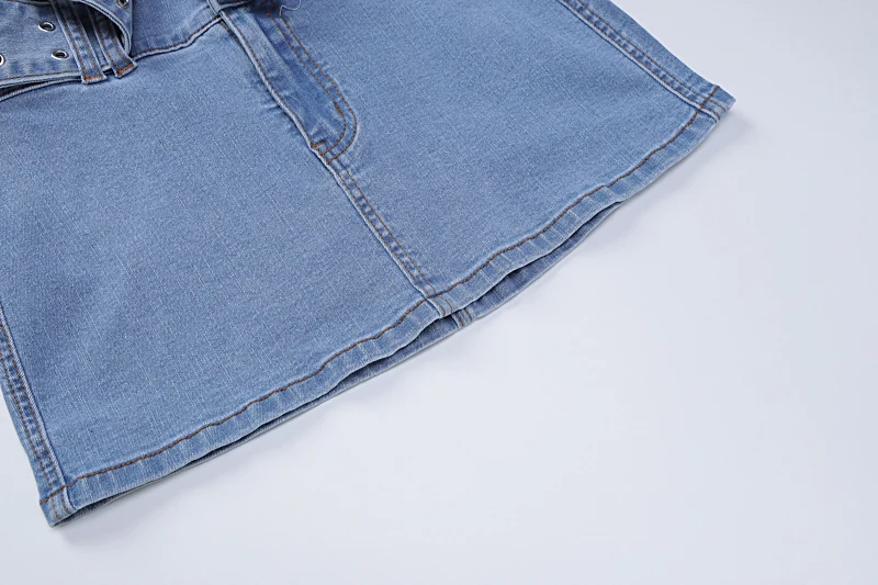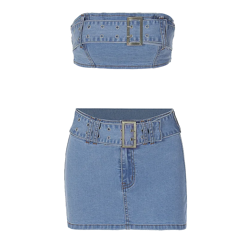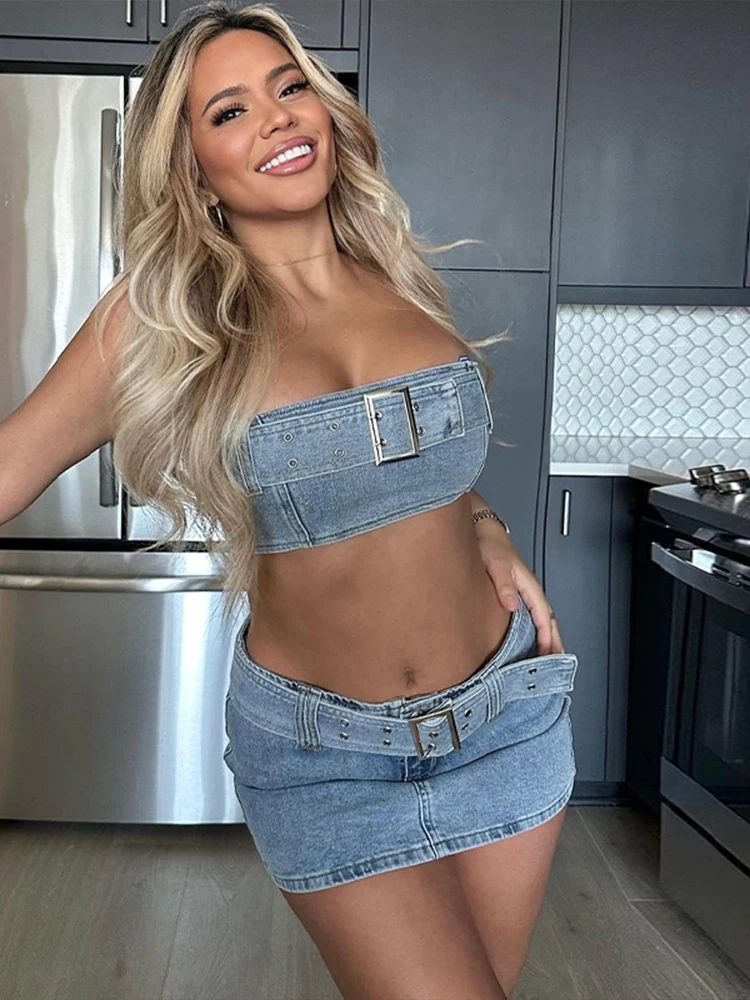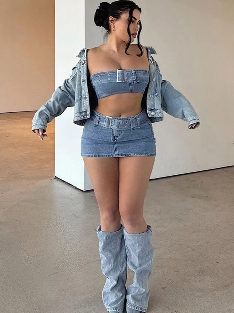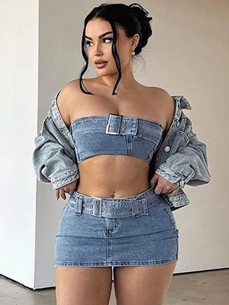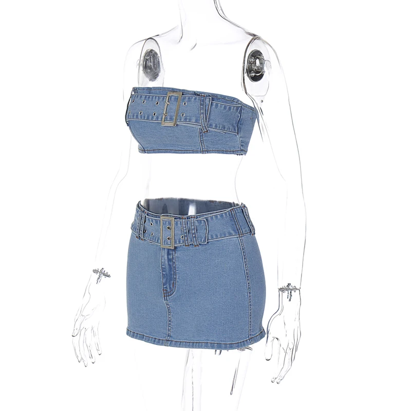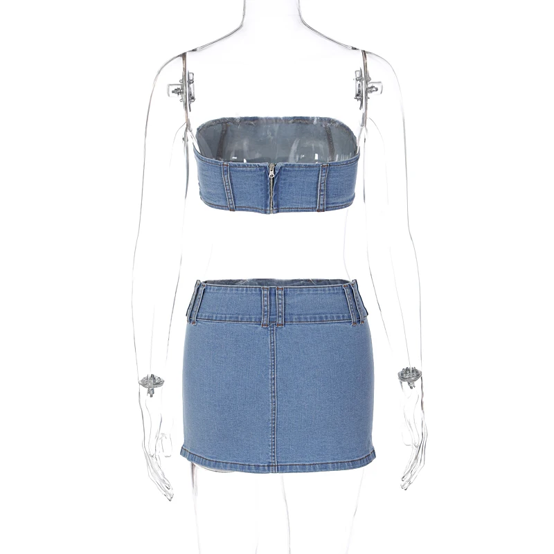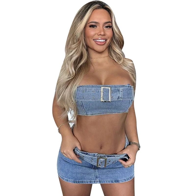 Denim Women Fashion Sets Strapless Belt Sexy Crop Top Zip Up Button Skirt