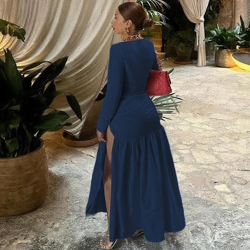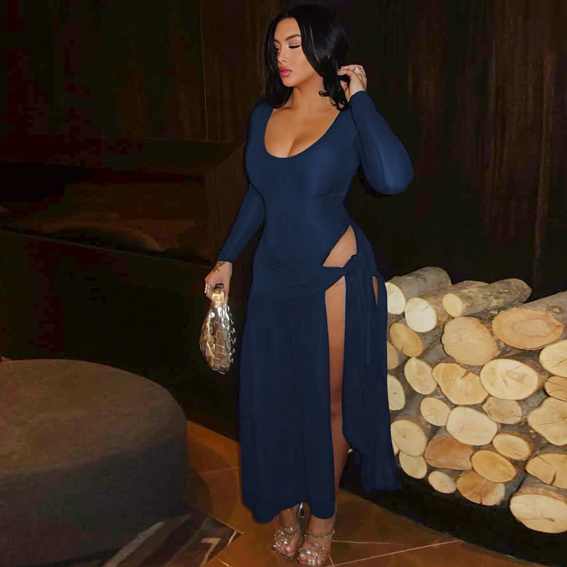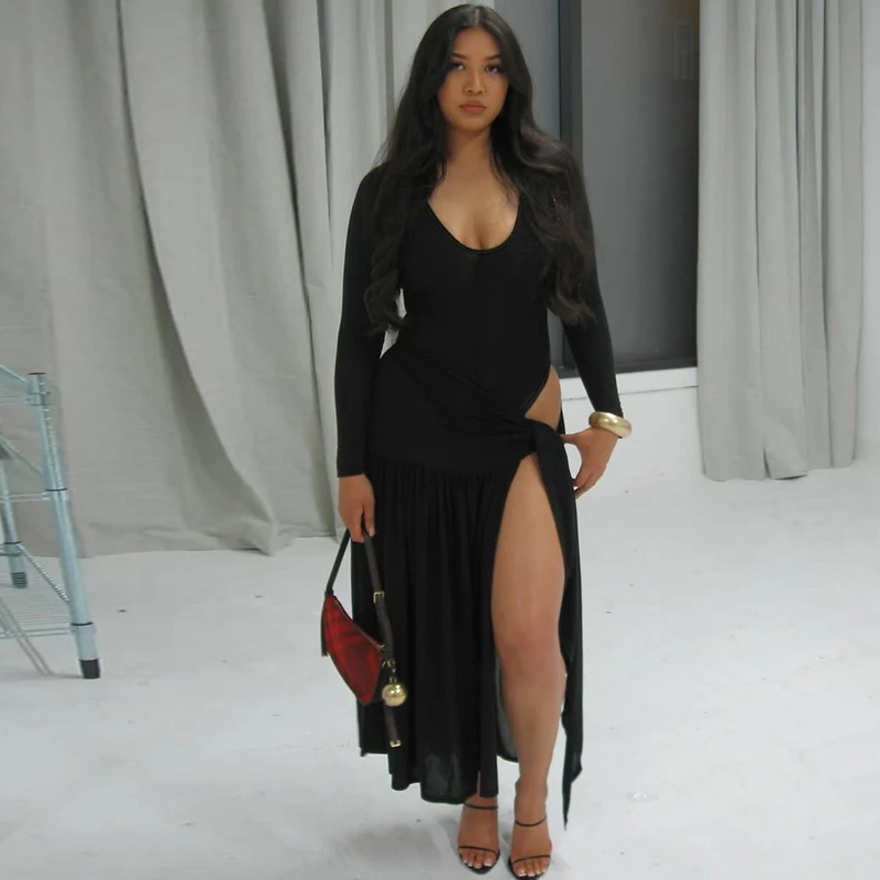 Fashion Sets Long Sleeve Solid Sexy Skinny Bodysuit Bandage Slit Maxi Skirt Women