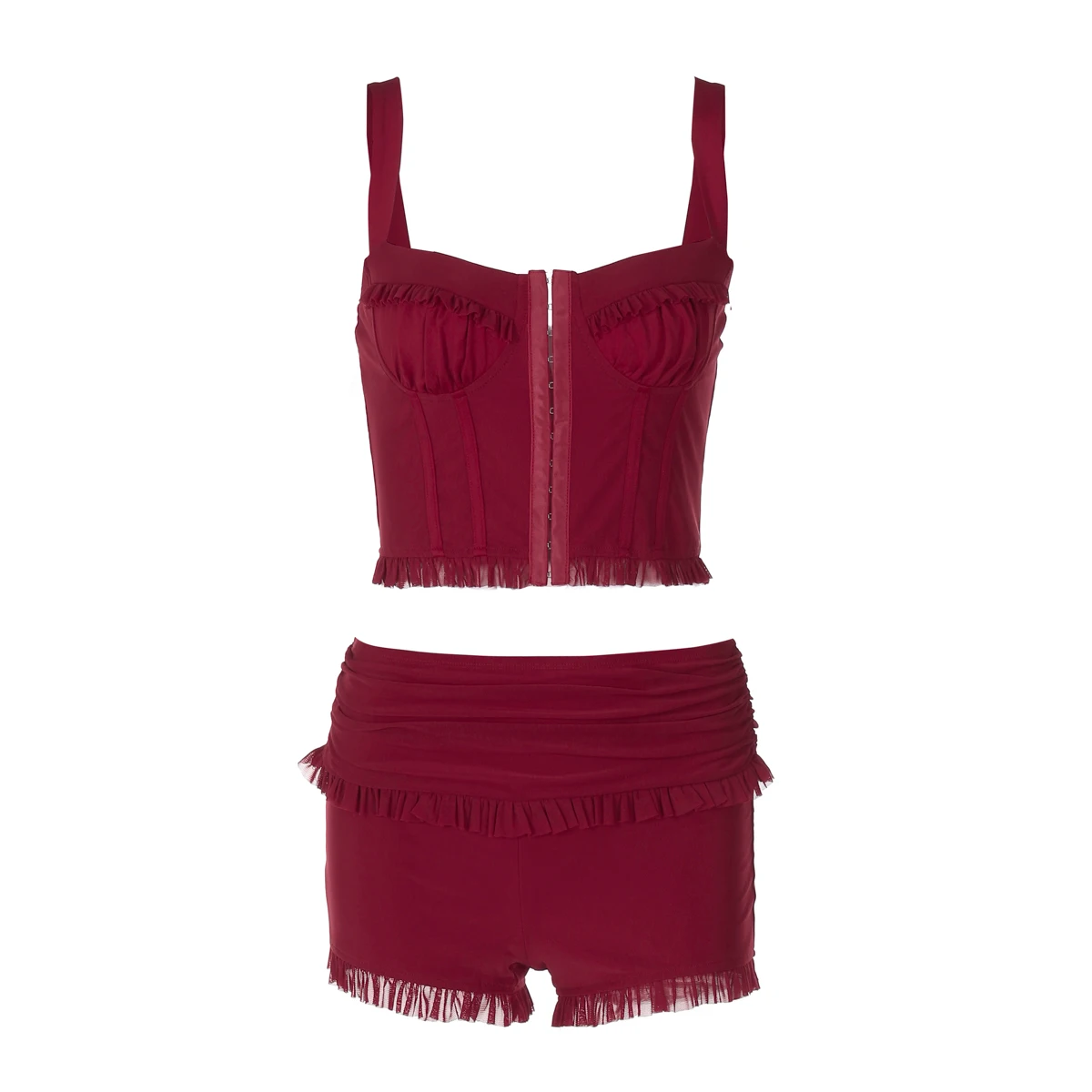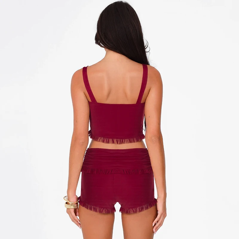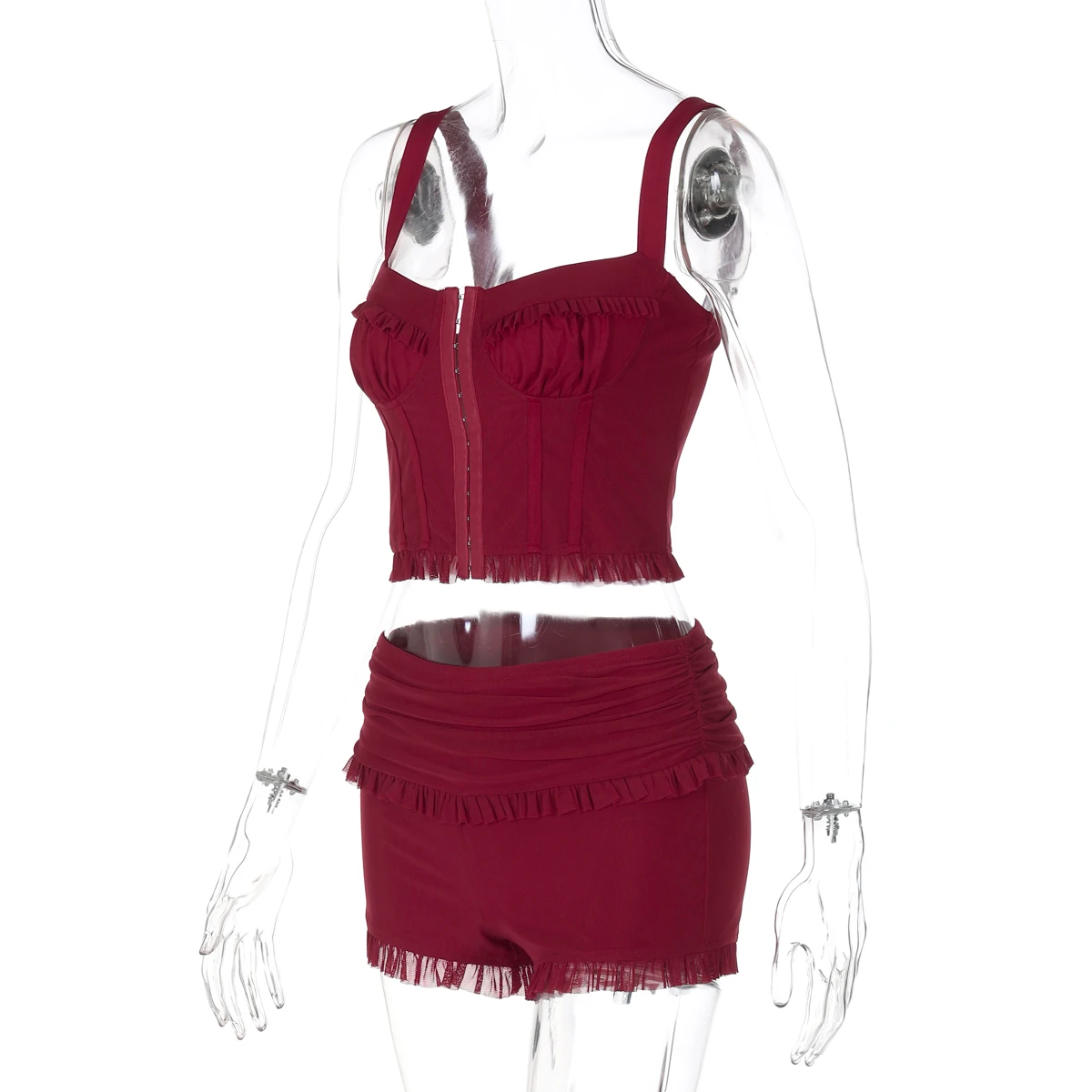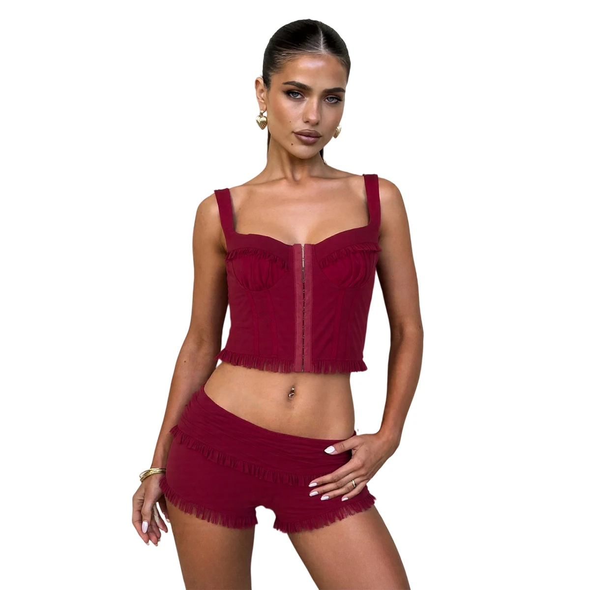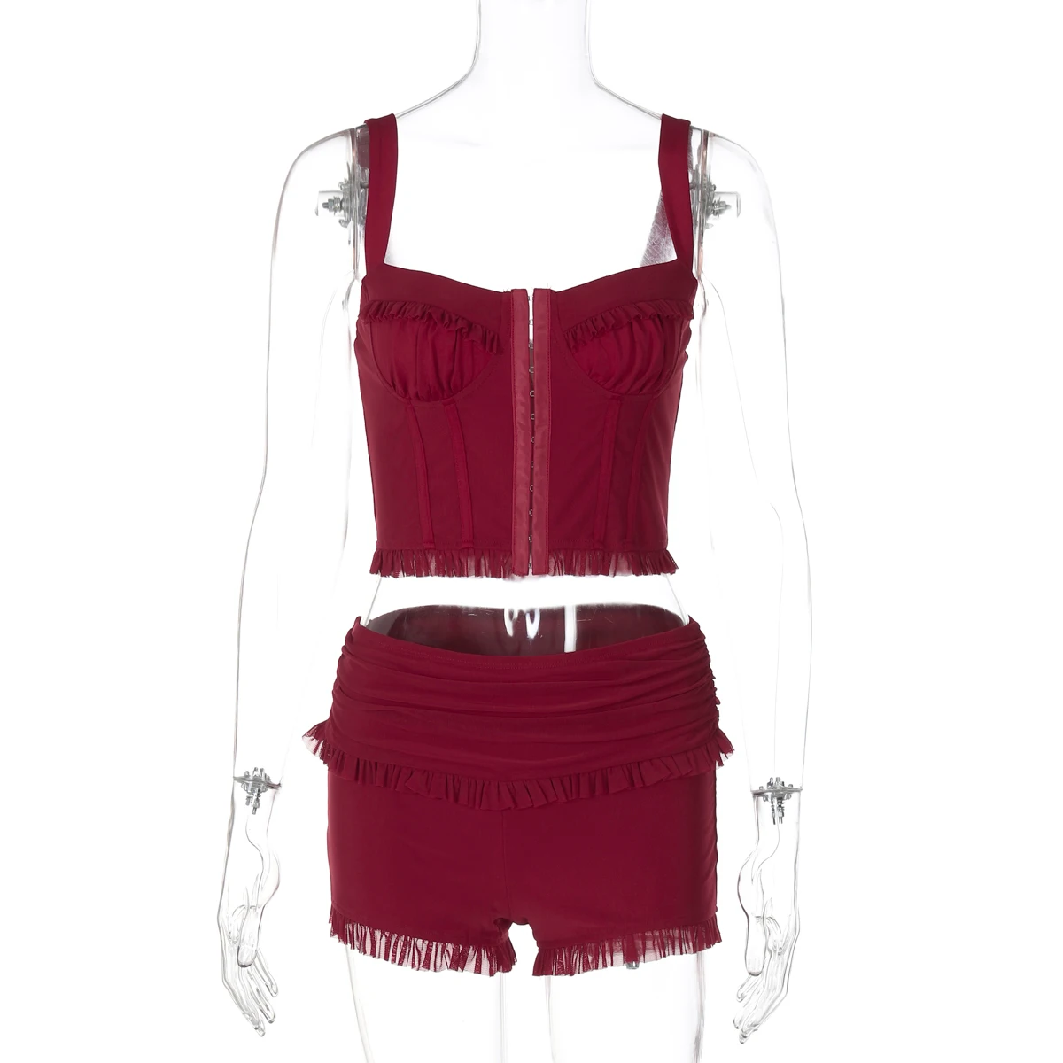 Fashion Sets Solid Ruffles Tassel Buttons Sexy Crop Tank Top Shorts Women