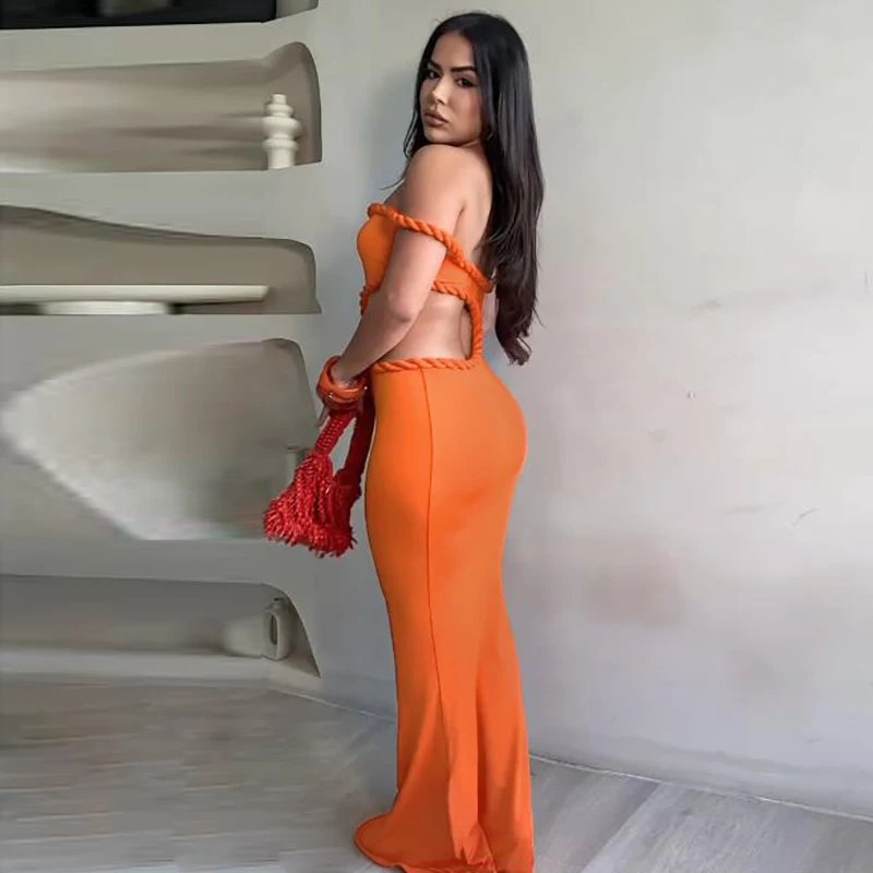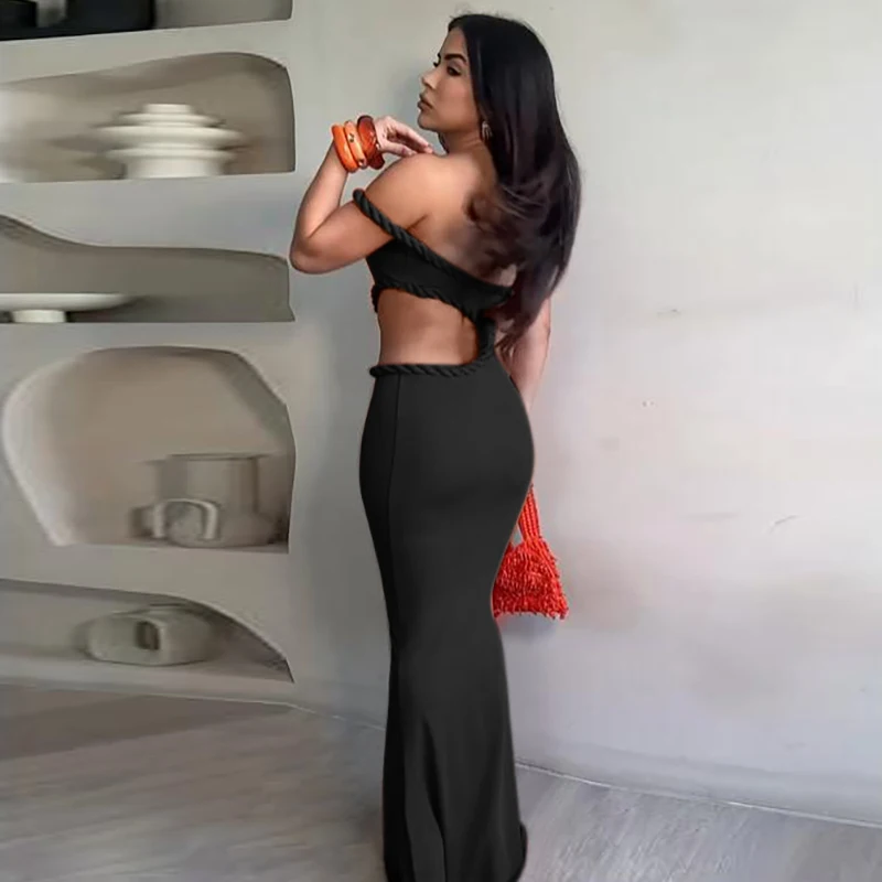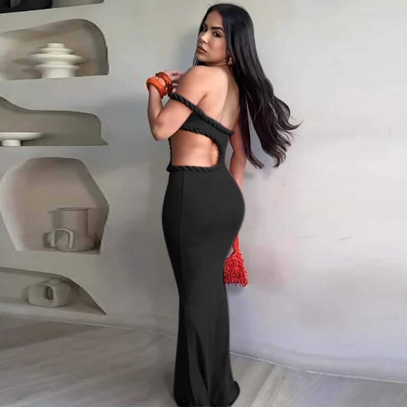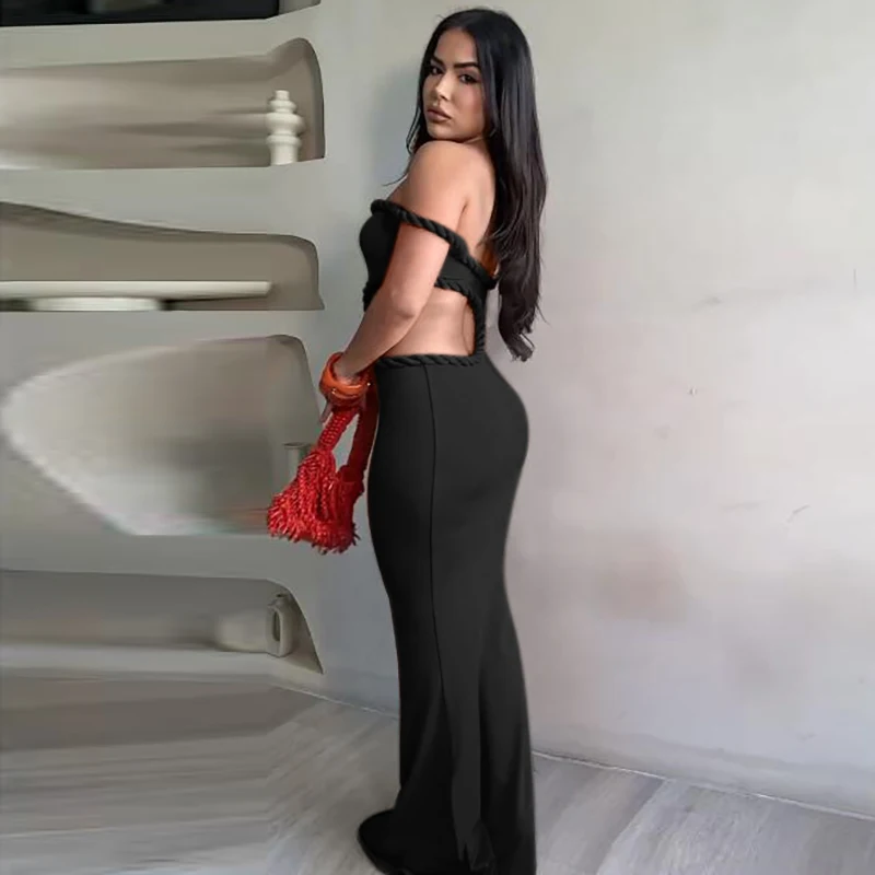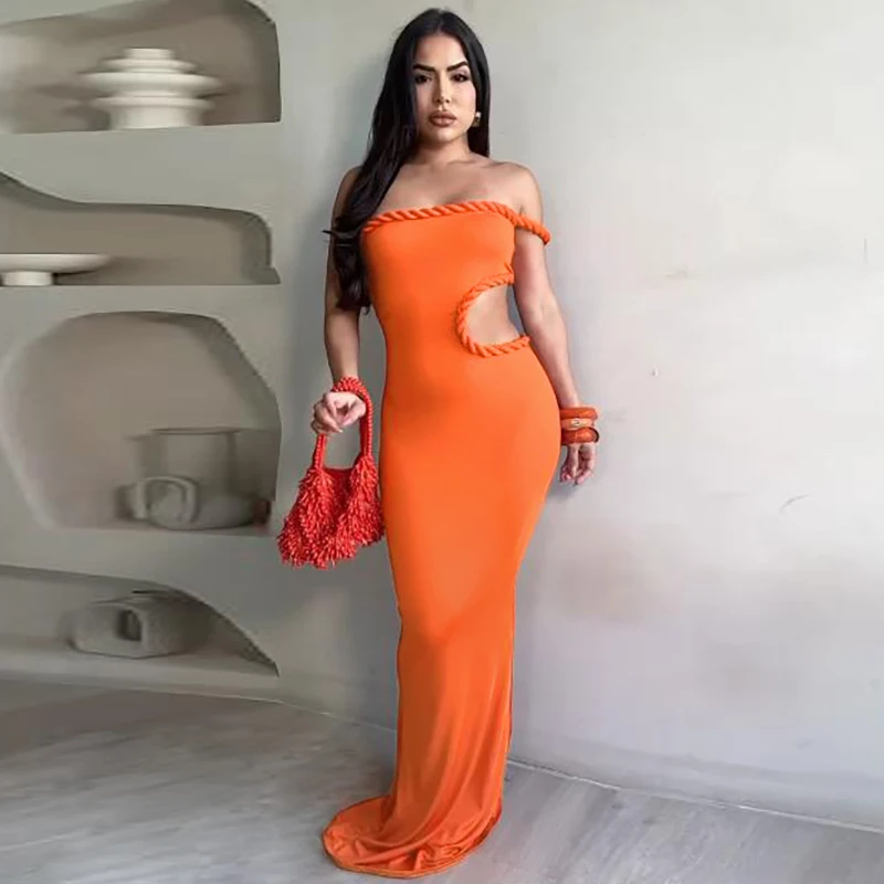 Fashion Strapless Backless Slip Solid Hollow Out Sexy Bodycon Maxi Dress Women Elegant Outfits Party Vacation