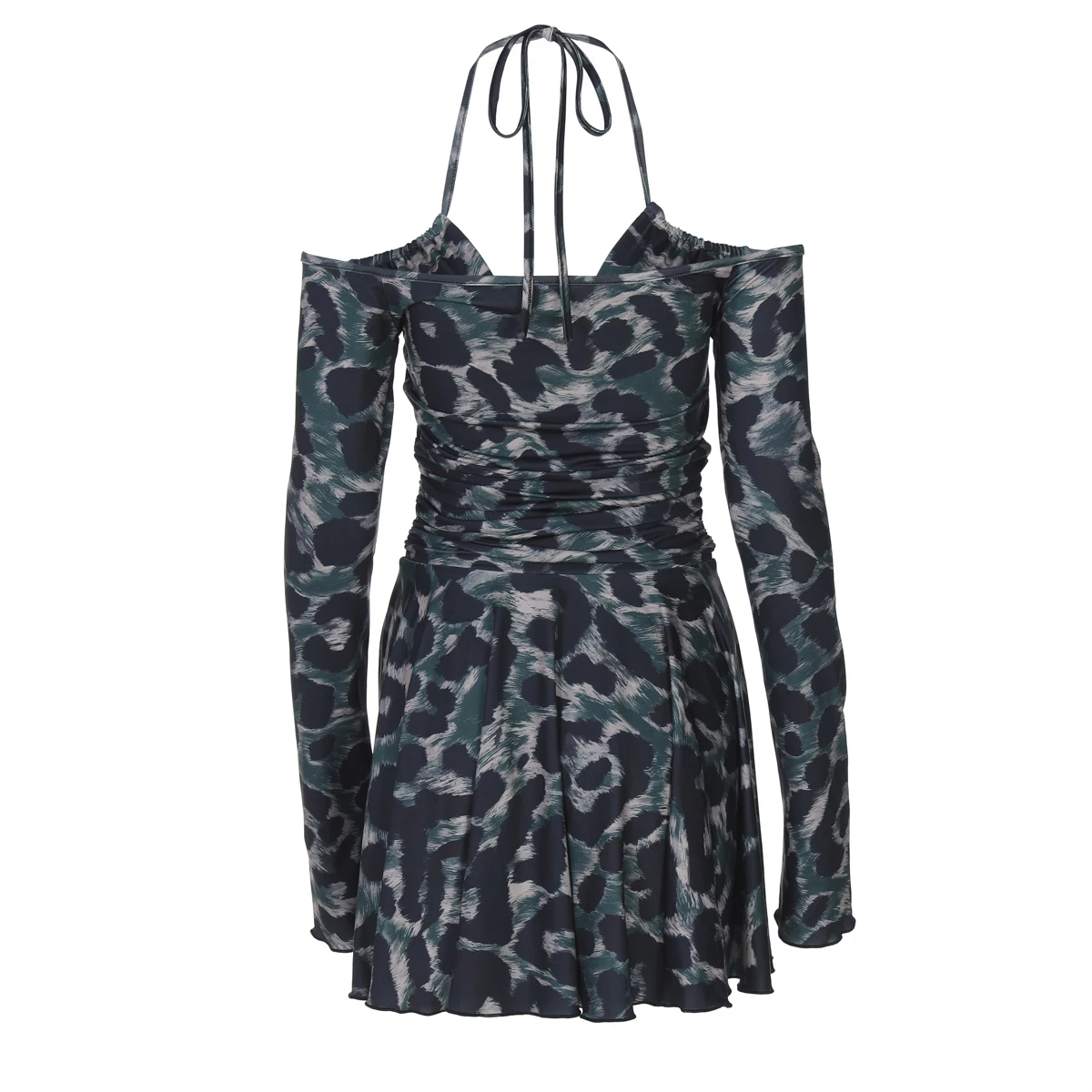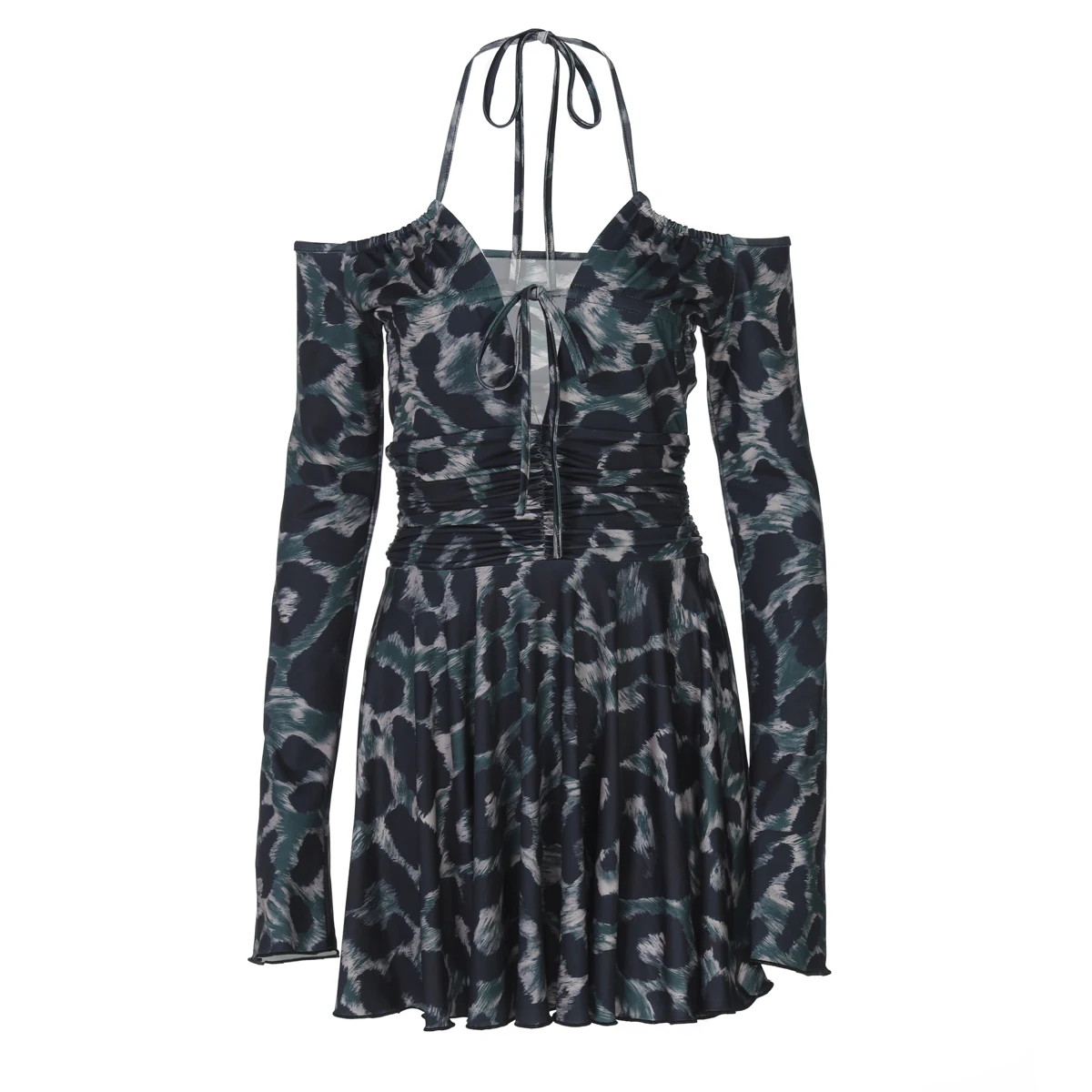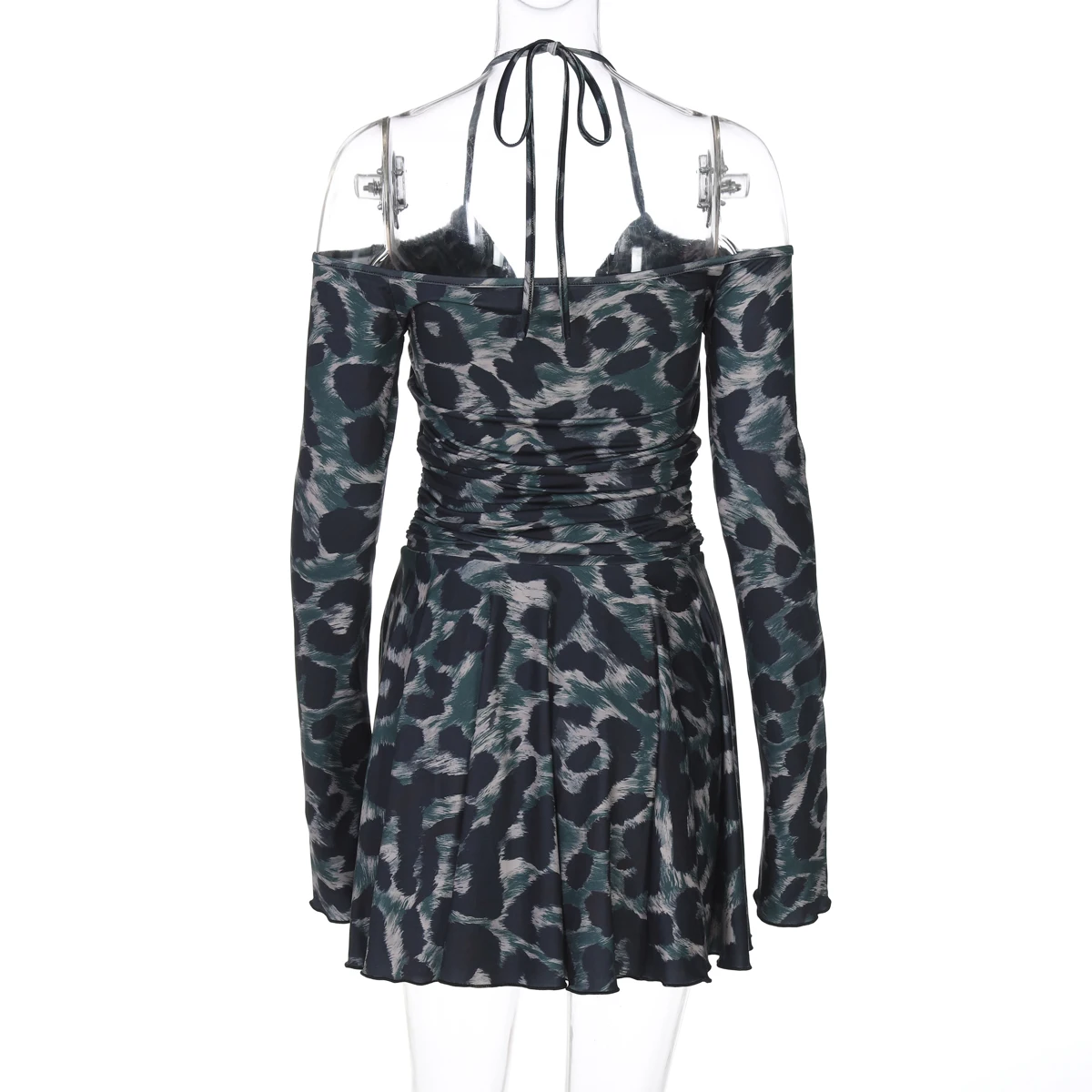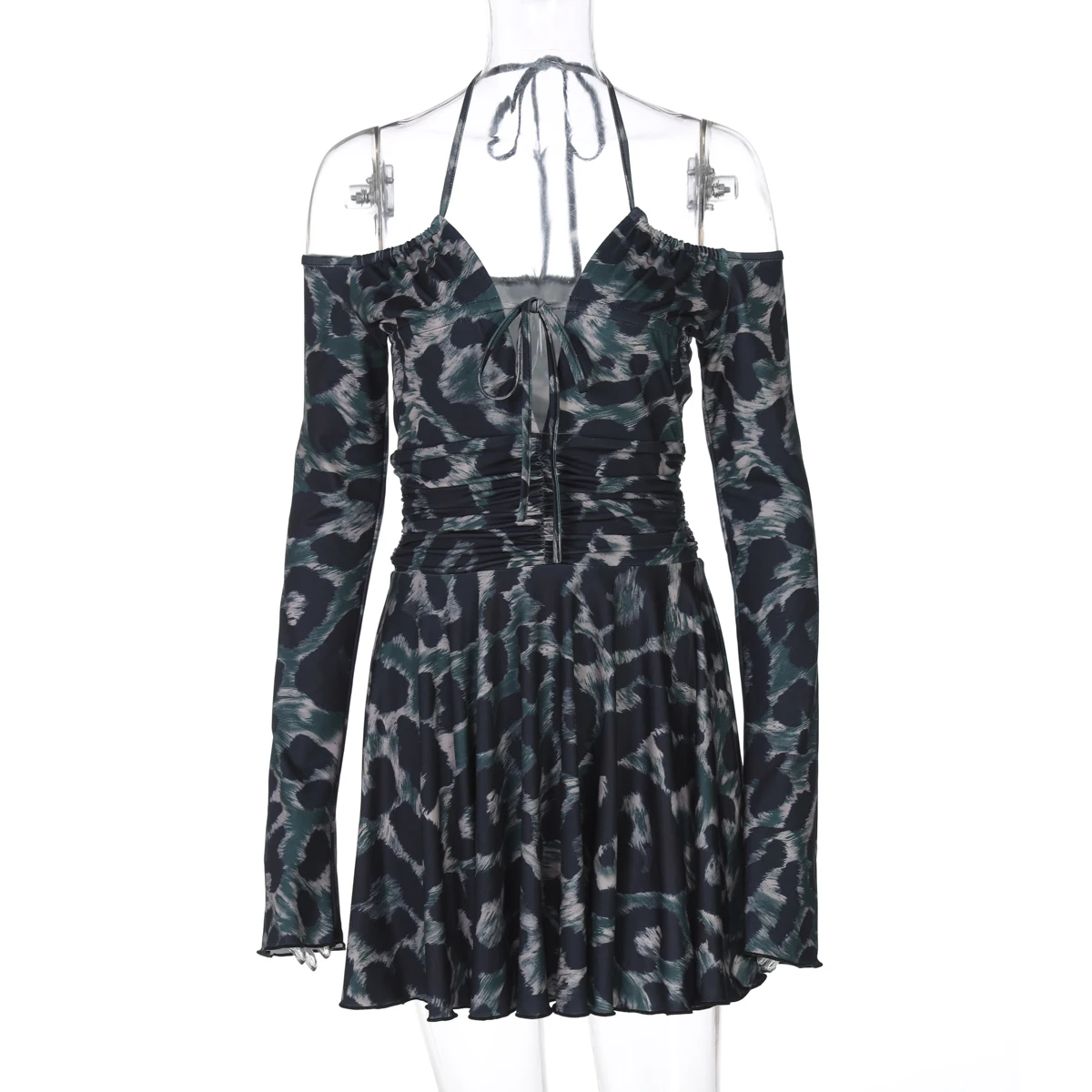 Leopard Print Halter Long Sleeve Lace Up Pleated Sexy Slim Mini Dress Women Fashion Y2K Clothes Streetwear Vacation