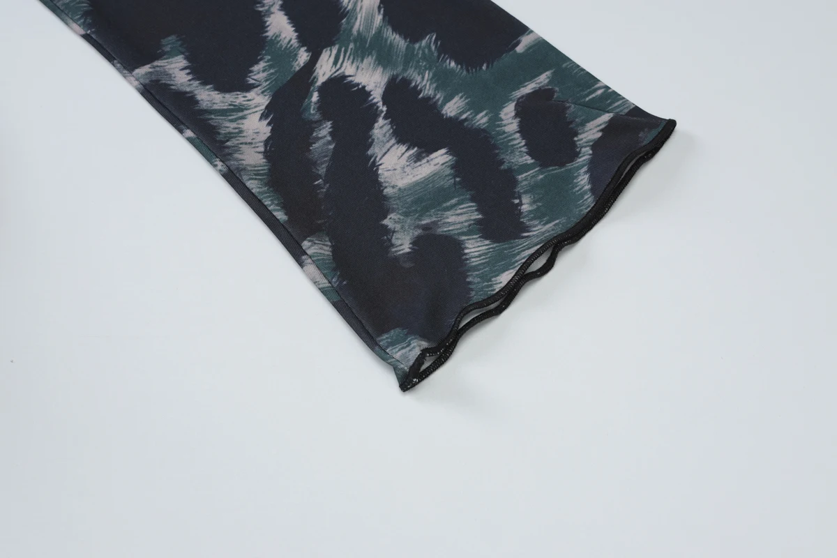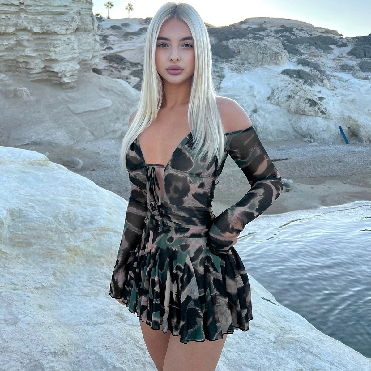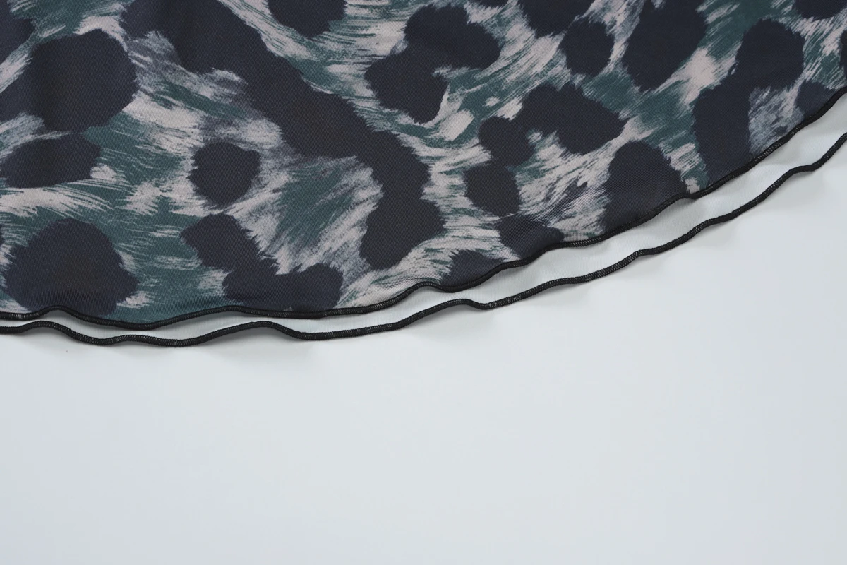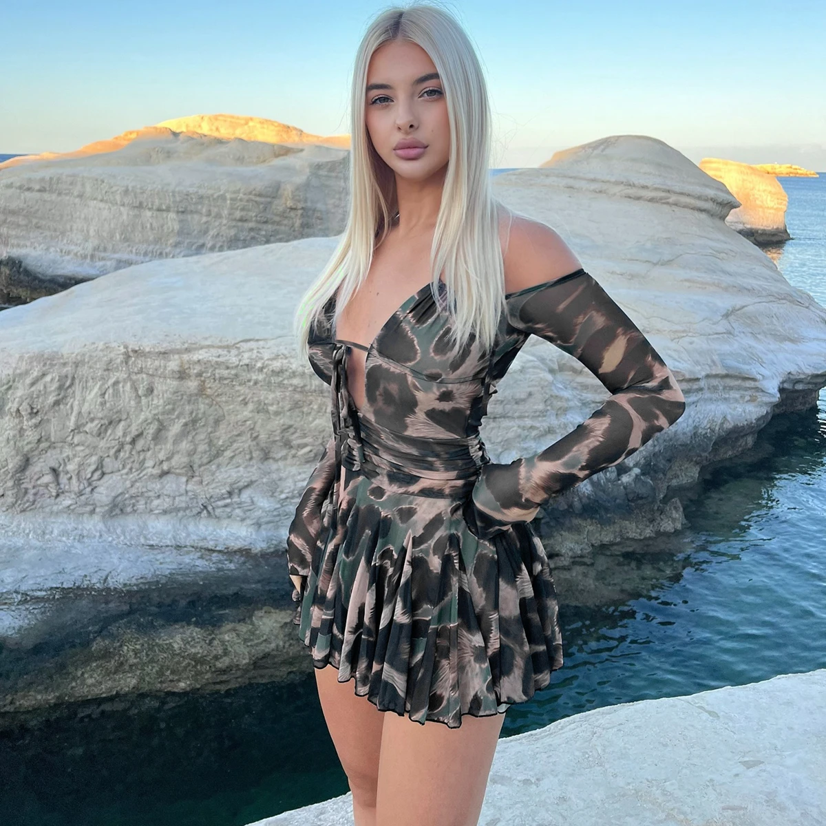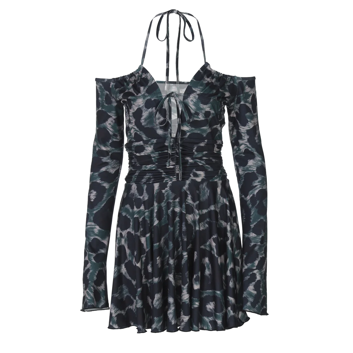 Leopard Print Halter Long Sleeve Lace Up Pleated Sexy Slim Mini Dress Women Fashion Y2K Clothes Streetwear Vacation