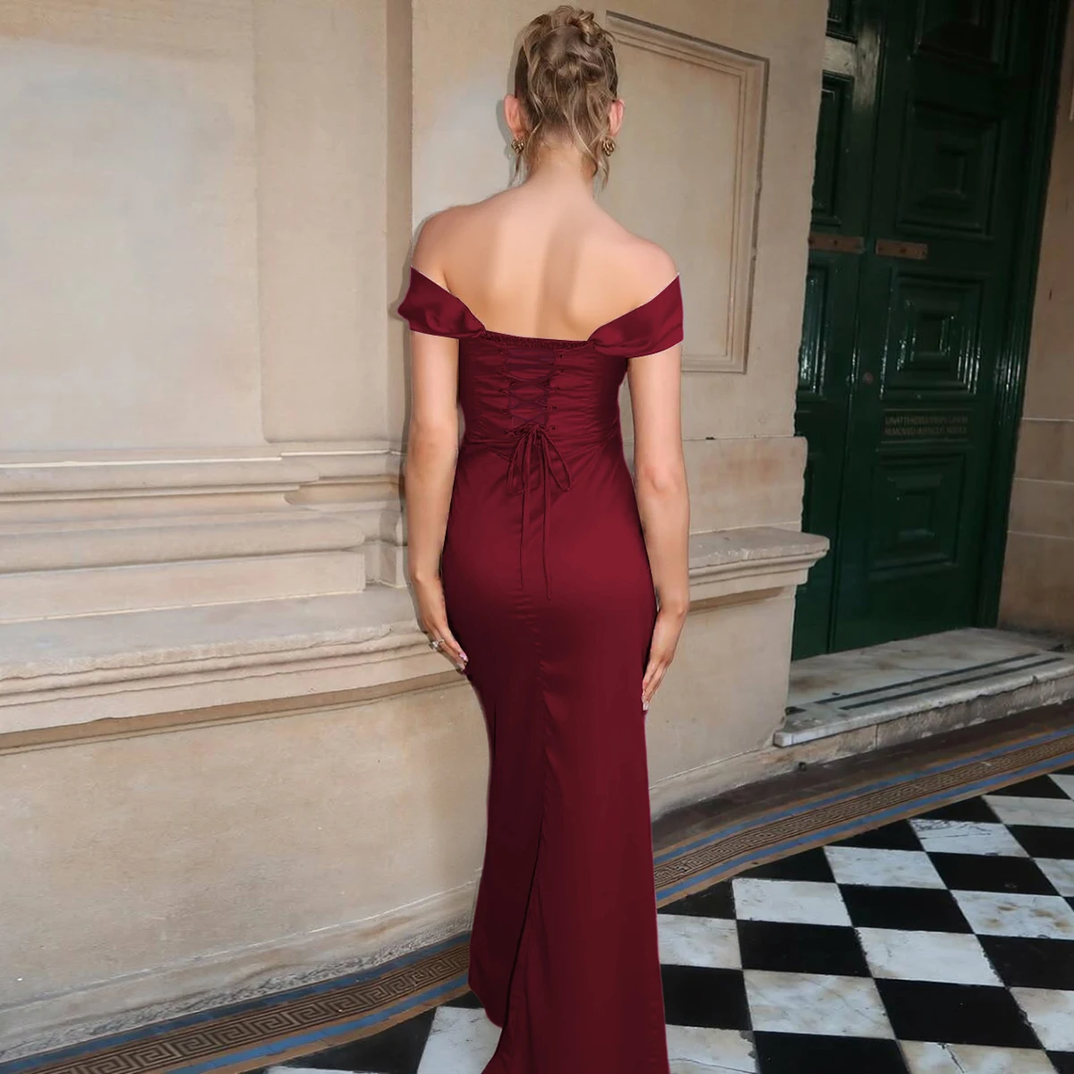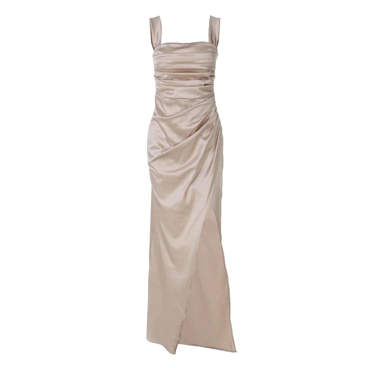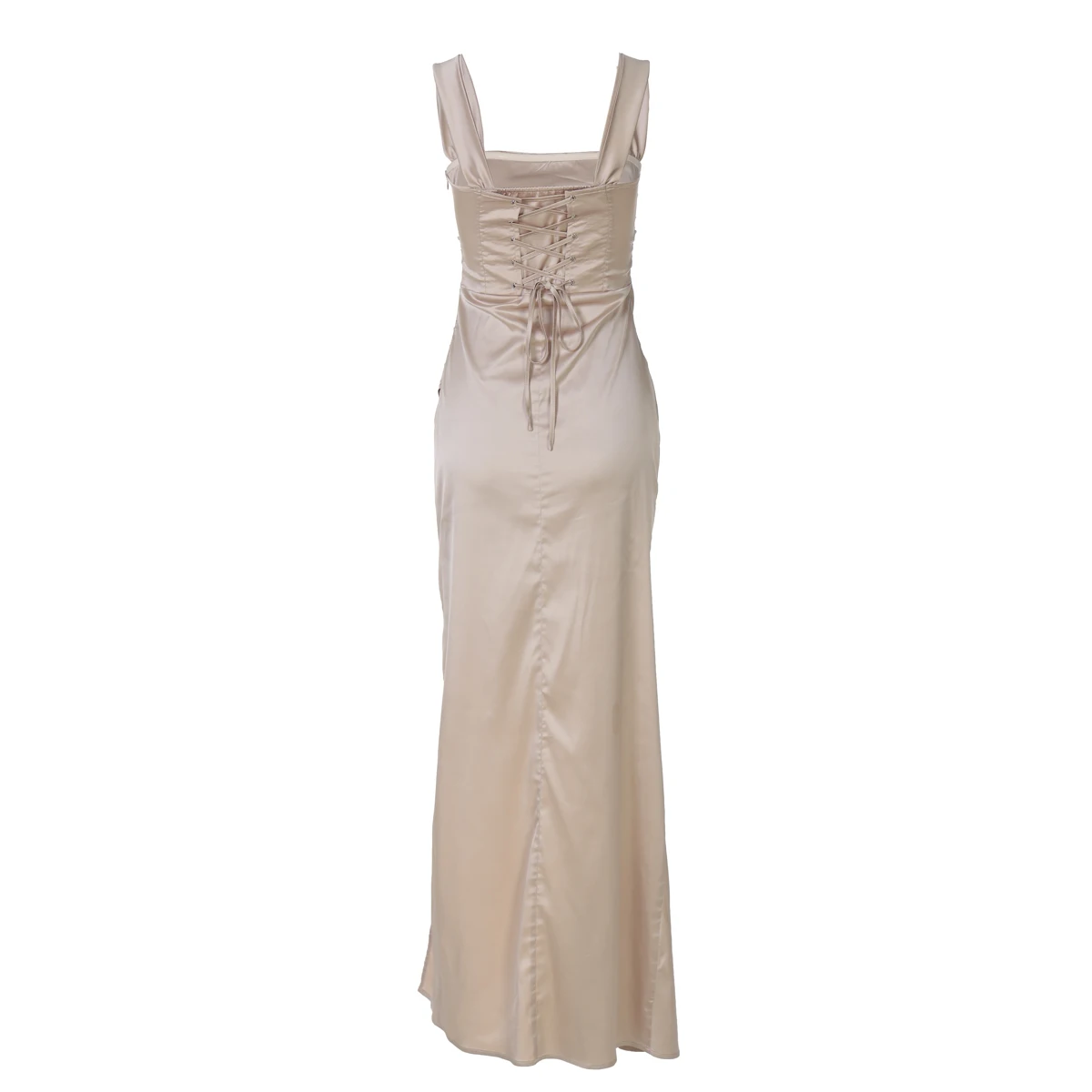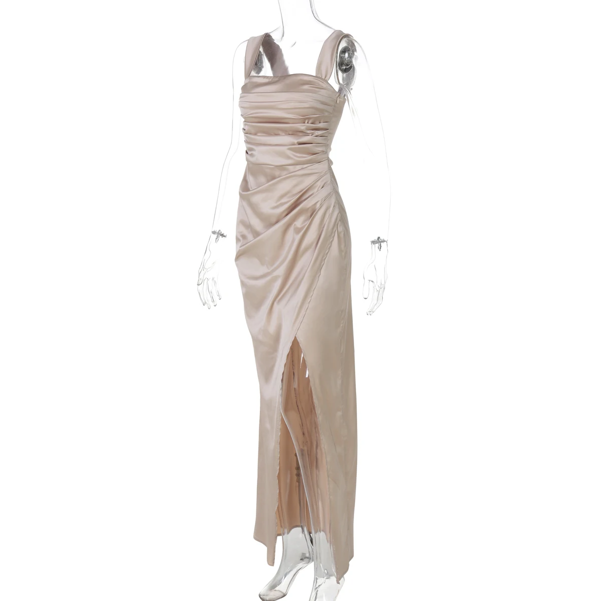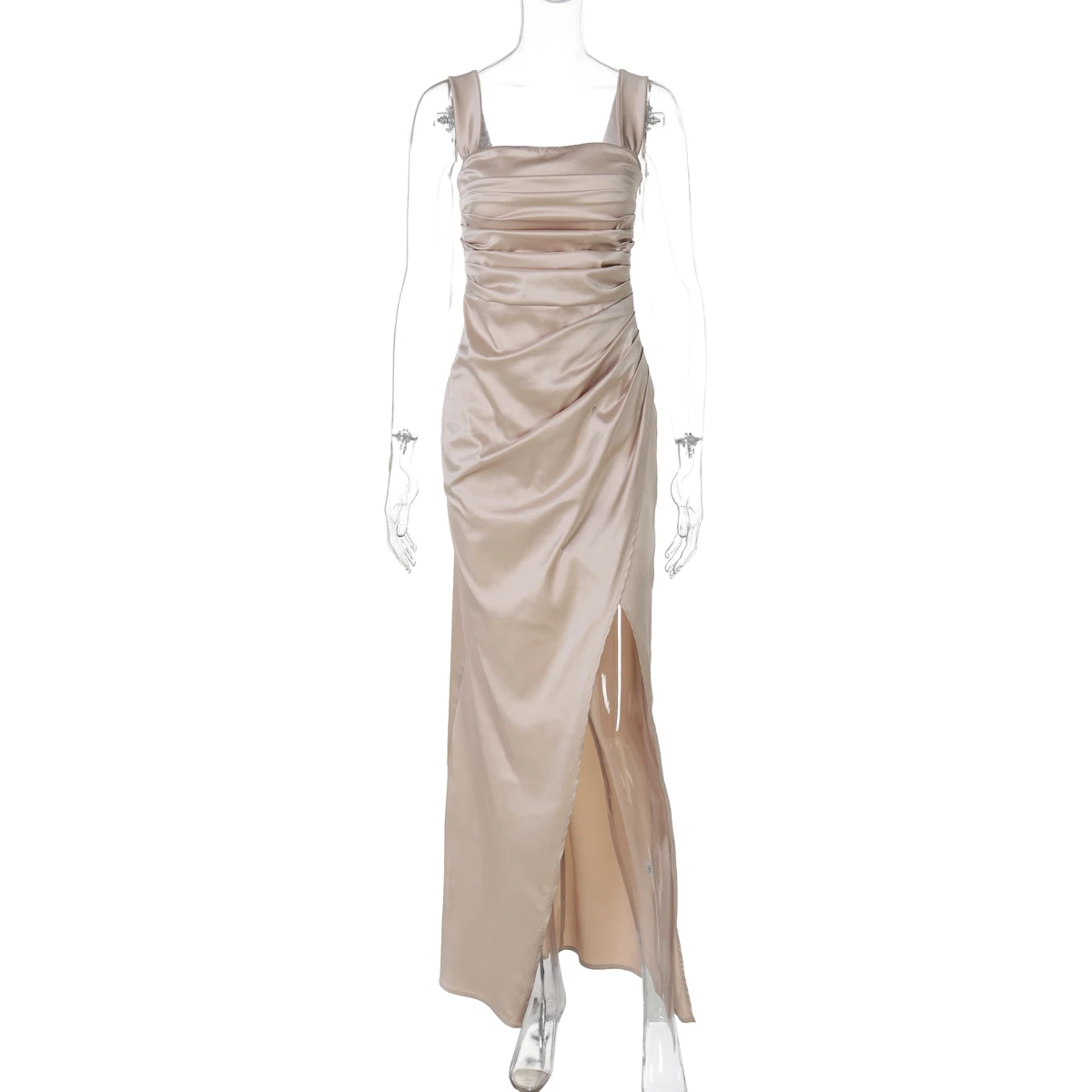Stain Straps Solid Ruched Lace Up Zipper Slit Sexy Elegant Maxi Prom Dress Women