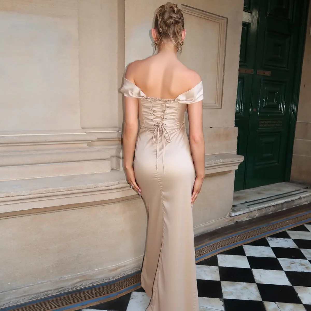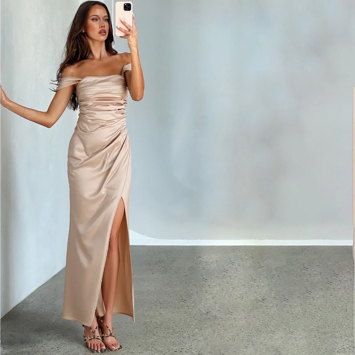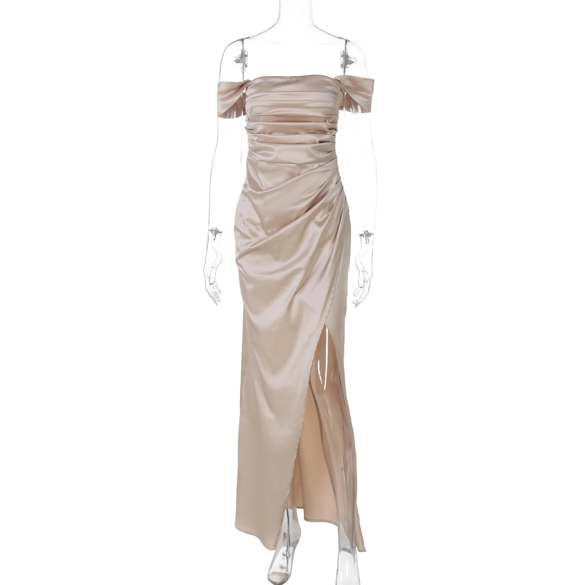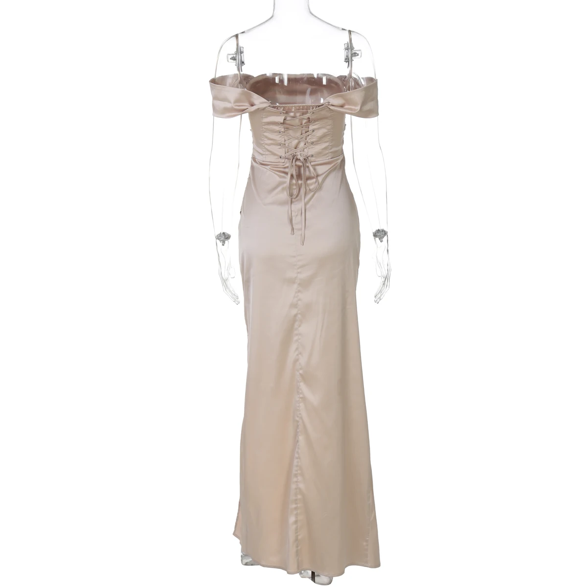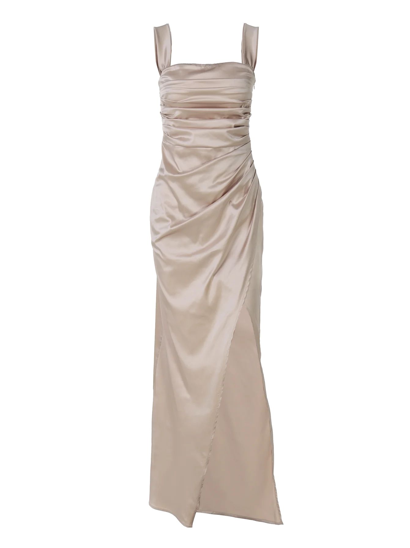Stain Straps Solid Ruched Lace Up Zipper Slit Sexy Elegant Maxi Prom Dress Women