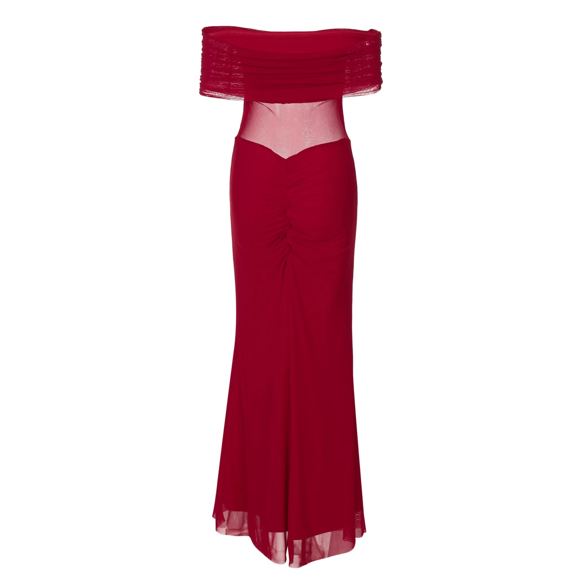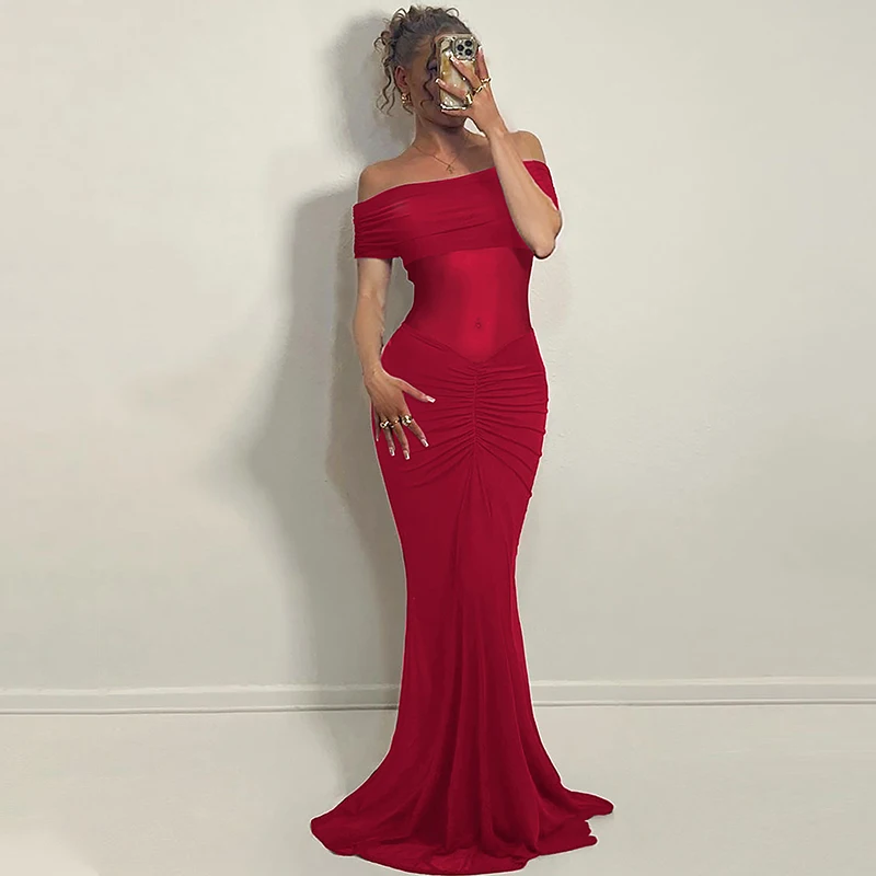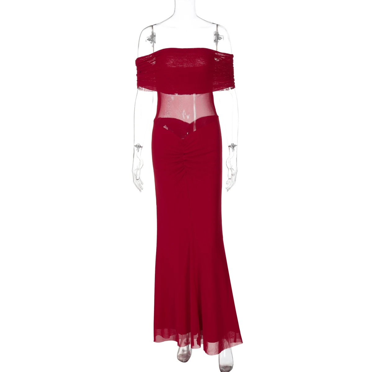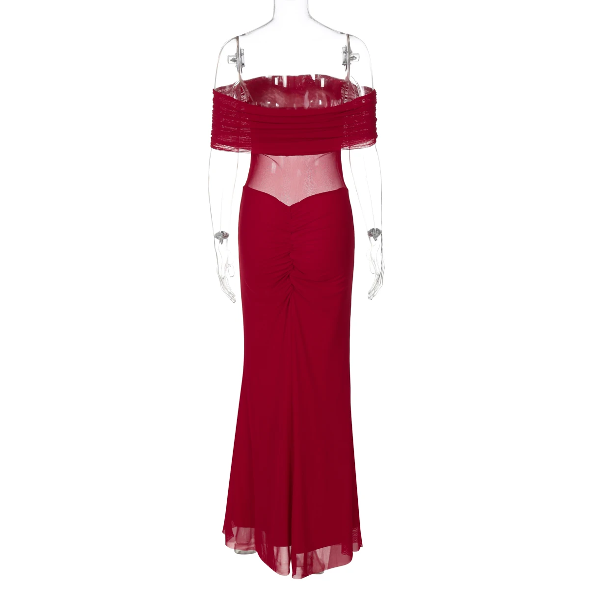 Women Elegant Slash Neck Sexy Ruched Patchwork Lace Maxi Dress See Through